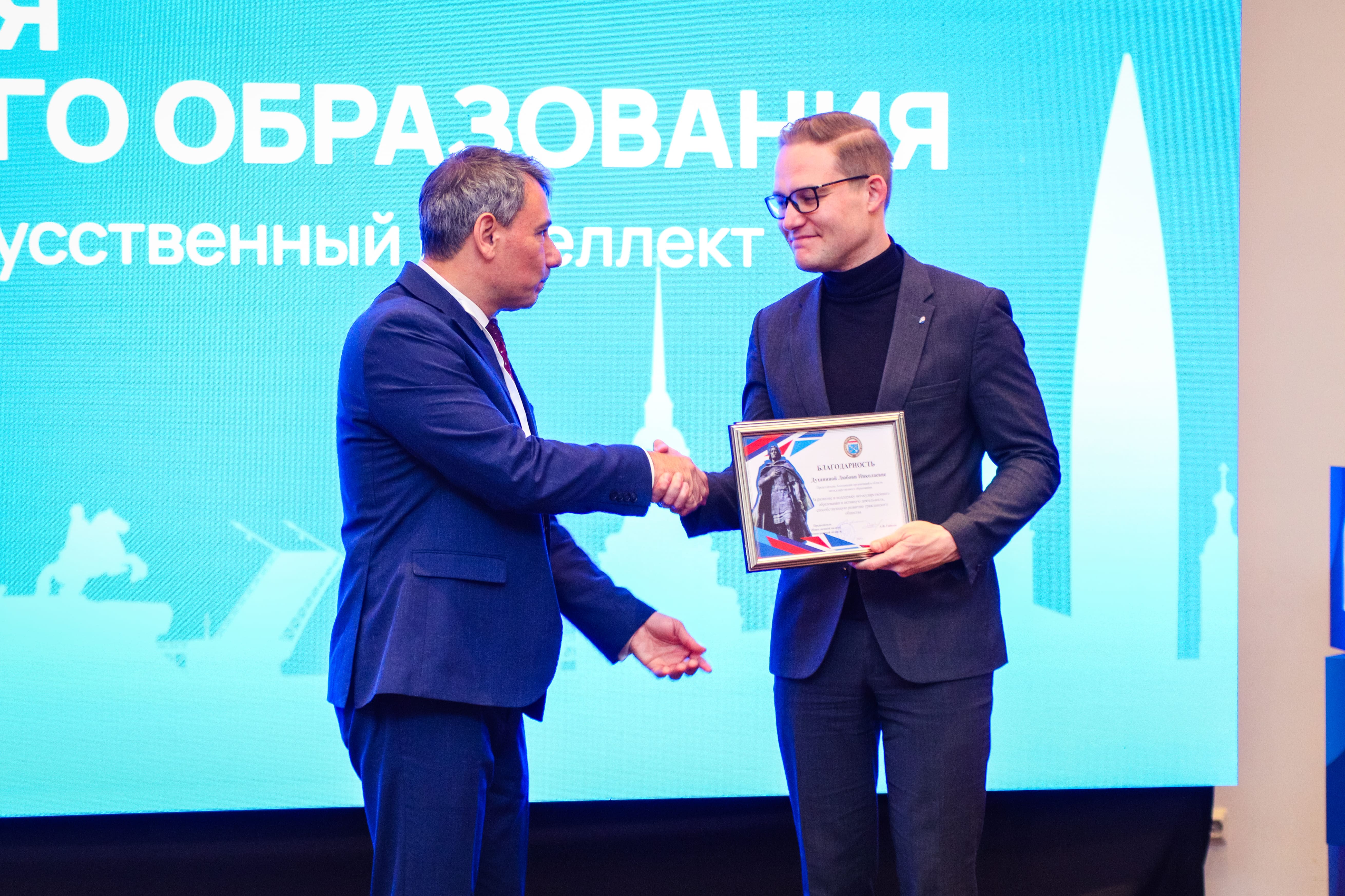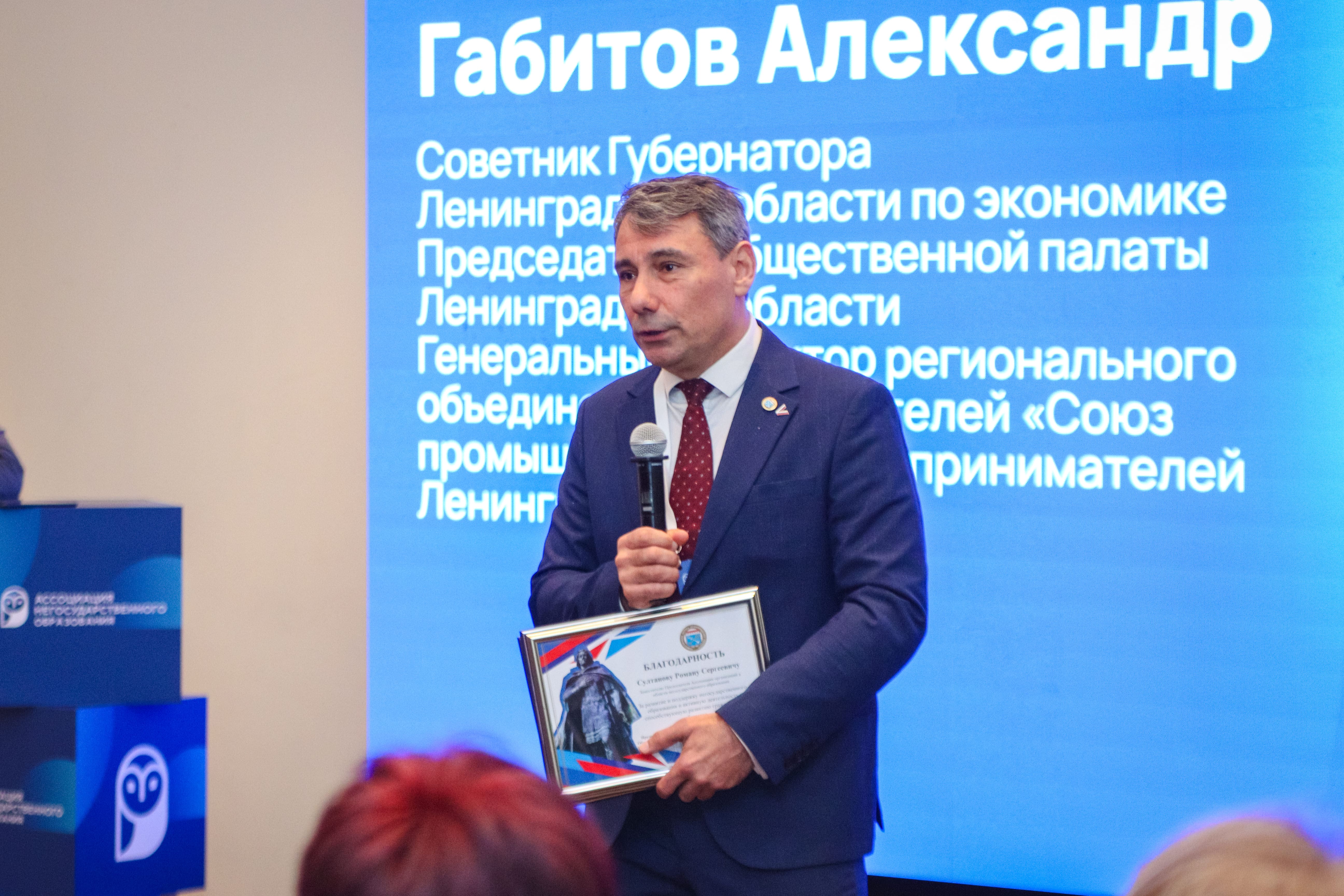 На Форуме-практикуме Александр Габитов, советник губернатора Ленинградской области по экономике и председатель Общественной палаты региона, вручил благодарности руководству Ассоциации негосударственного образования.
